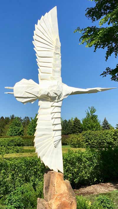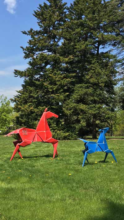 The exhibition of 18 awe-inspiring large-scale sculptures features flying birds, painted ponies, emerging butterflies, floating boats, a majestic tower that creates the illusion of 1,000 stainless steel origami peace cranes hovering above the water, and more.